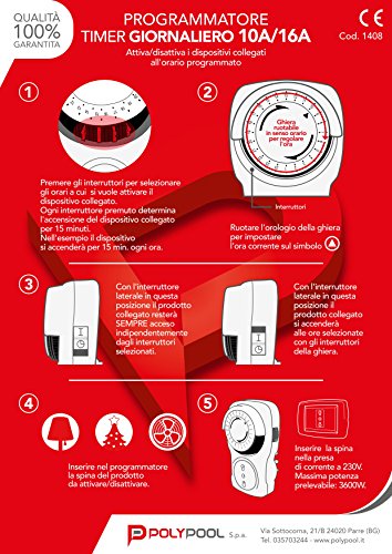 COMODO DA USARE | Il programmatore di prese elettriche Poly Pool è facile e pratico da utilizzare. La qualità dei materiali, il design permettono l'utilizzo di questo prodotto con la maggior parte dei dispositivi elettrici presenti in ambienti domestici. Il timer programmabile alimenta automaticamente, negli orari programmati, i dispositivi elettrici collegati.