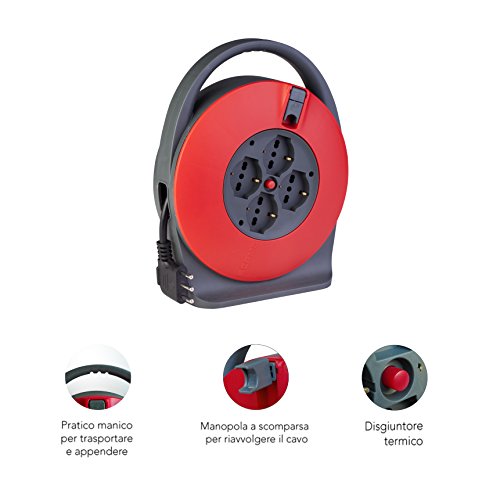 Poly Pool PP2742 Avvolgicavo 10 m Sezione Cavo 3G1,5 mm² con 4 Prese Pluristandard e Spina Salvaspazio Italiana Grande 16 A con Manico e Disgiuntore Termico