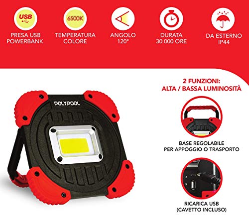 POLY POOL - PP3142 Proiettore Luce LED da Esterno Portatile 10W 600LM - Faretto LED da Esterno Ricaricabile USB e Power Bank - Impermeabile IP44 - Base Regolabile Faro LED da Garage Cantiere Campeggio