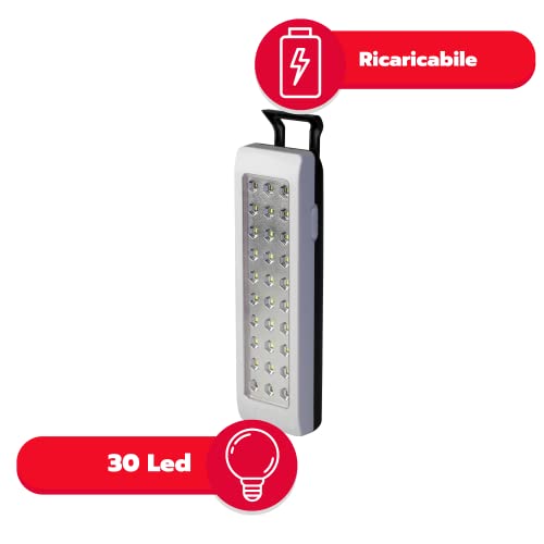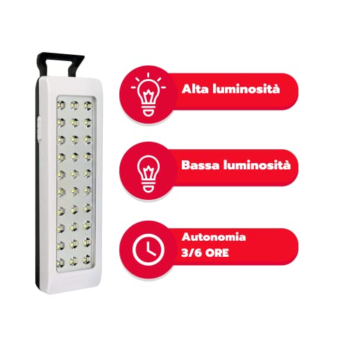 CARATTERISTICHE TECNICHE | Lampada emergenza portatile/da parete, 30 led, 150 lumen, 80cm cavo con spina 10A 2P 230V~. La luce d'emergenza ha un interruttore 3 funzioni: OFF, bassa luminosità, alta luminosità. La lampada d'emergenza ha un'autonomia 6 ore (bassa luminosità), 3 ore (alta luminosità), tempo di ricarica 15h. Dimensioni 43x68x243cm .