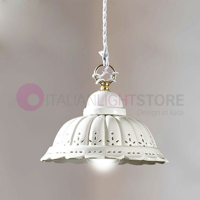 Lampada a sospesione in ceramica bianca con particolare lavorazione traforata a merletto. Lampadario a sospensione ideale per l'illuminazione della cucina o del tavolo da pranzo, in stile classico rustico country, collezione Pomarance di Ceramiche Borso . La lampada ha un originale diffusore in ceramica bianca lucida, arricchito da una particolare lavorazione traforata con effetto merletto;