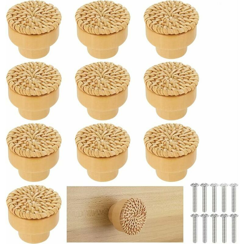 la loro superficie è verniciata, impermeabile agli insetti, impermeabile alla muffa. Superficie liscia senza bordi e angoli, molto sicura per i bambini. [Dimensioni perfette] Riceverai 10 pezzi di maniglie per porte in legno (3,5 * 3 cm), adatte per la maggior parte delle dimensioni di porte, armadi o cassetti. Piccolo e raffinato, facile da installare e trasportare. [Facile da installare] I nostri pomelli per cassetti in legno con cacciavite per armadi e cassetti sono molto facili da installare, non è necessario acquistare accessori extra, puoi installarli a mano direttamente, soddisfa le tue diverse esigenze. [Squisito design fatto a mano] Questi pomelli per mobili in rattan fatti a mano, che mantengono il loro stile naturale, combinati con pomelli in legno per portare eleganza e moda, stile boho e stile country retrò ai tuoi mobili .