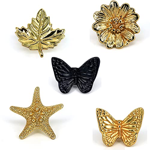 Specifiche del prodotto: materiale: lega di zinco, trattamento superficiale: galvanica. Modello opzionale: Foglie dorate, farfalle dorate, farfalle nere, fiori dorati, stelle marine dorate. Dimensioni della vite: 4 x 22 mm. Contenuto della confezione: 2 pomelli per armadietto, 2 viti.