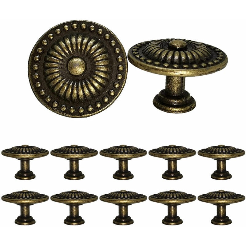 Materiale: lega di zinco Diametro: 29 mm Altezza: 20 mm Fornisce 10 pomelli per cassetti con viti. Si adatta alla maggior parte dei pannelli delle ante fino a 0,9 pollici/22 mm di spessore. La maniglia rotonda dell'anta dell'armadio con un bellissimo motivo floreale è delicata e pratica. Decora perfettamente qualsiasi armadio, comò, scrivania, scarpiera, cassetto e altro ancora.