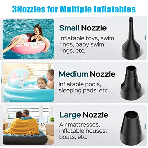 【3 ugelli di diverse dimensioni】 Ogni pompa per materasso ad aria è dotata di 3 ugelli di diverse dimensioni (taglia S, M e L). Taglia S per gonfiare piccoli giocattoli o anelli da nuoto gonfiabili. Taglia M per gonfiare lettino, seggiolino gonfiabile per piscina;