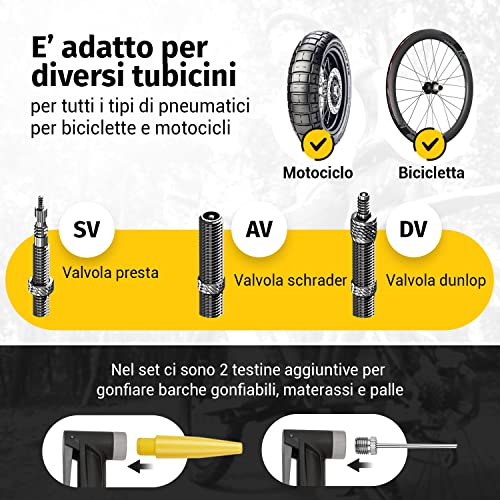 ✅ IDEALE per tutte le valvole: la pompa ad aria per bicicletta elettrica si adatta a tutte le valvole: valvola auto, valvola Schrader, valvola Sclaverand, valvola francese, valvola Presta, valvola Dunlop e valvola flash