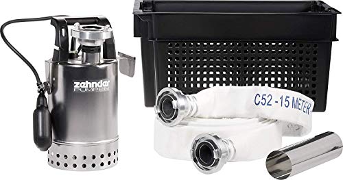 Il set è composto da: una pompa in acciaio fine E-ZW 65A con valvola battente integrata, galleggiante con guarnizione galleggiante e fissaggio per fissare la pompa nella scatola e al raccordo pompiere C, tubo C da 15 m con raccordo antincendio, protezione da pieghe e inceppamenti in acciaio fine per il tubo Scatola di trasporto con fori di 8 x 8 mm, può essere utilizzato anche come gabbia protettiva per la pompa
