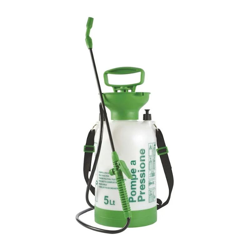 Pompa a pressione a spalla, realizzata in PVC per irrorazione piante. Ideale per orto, giardino o vivaio. L'ugello regolabile consente di spruzzare un unico getto oppure di nebulizzare l'acqua per un naturale effetto foschia. Non utilizzare con solventi o sostanze infiammabili. Capacità serbatoio: 5 litri Lancia in plastica da 44 cm circa Lunghezza tubo 130 cm circa