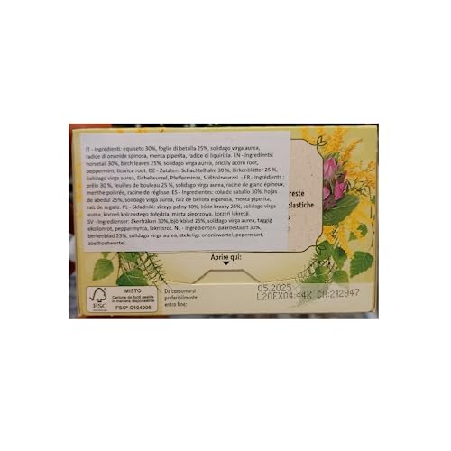 [DRENANTE] - La tisana drenante, contiene ingredienti quali l'equiseto e la betulla, tradizionalmente noti per favorire il processo di diuresi e l'eliminazione dei liquidi in eccesso. Ha un gusto gradevole sia al naturale, sia con l'aggiunta di zucchero o miele.