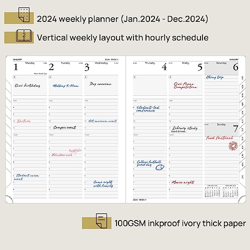 POPRUN Agenda settimanale 2024, 26,5 x 21,5 cm, copertina rigida, grande, 24 pagine settimanali, con pagine punteggiate, tasca interna pieghevole, carta FSC® da 100 g/m², blu navy