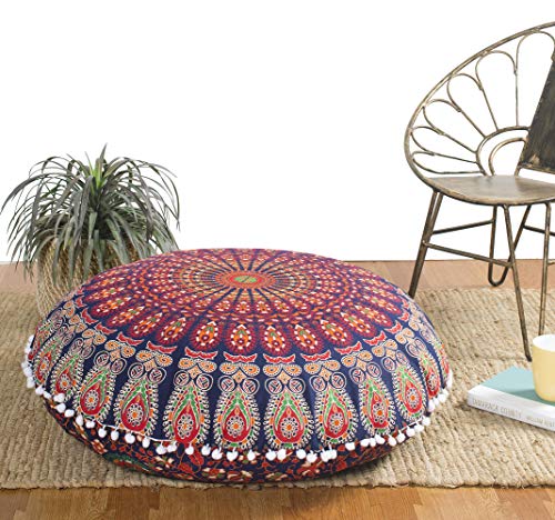 Popular Handicrafts Federa per cuscino da pavimento, motivo mandala hippie, grande, con pon pon morbidi particelle, per pouf rotondo, decorazione yoga bohemien, 81,3 cm, blu navy