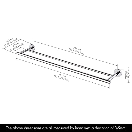 Dimensioni: La lunghezza totale è 761 mm. La lunghezza utile per questo portasciugamani a parete è di 702 mm. La proiezione è di 145 mm. La distanza tra due binari è di 63 mm, fornendo spazio sufficiente per asciugare gli asciugamani.