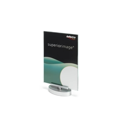 Porta-avvisi girevoli da banco in polimetilmetacrilato con base in metallo. Disponibili in formato A5 e A4 (questo prodotto è in formato a4 verticale). Si possono utilizzare anche come portafoto. Colore trasparente con base gri...