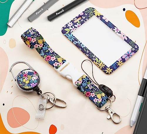Porta badge identificativo con cordino, porta badge retrattile con cordino staccabile con bobina per badge e porta documenti verticali per infermiere, insegnanti, ufficio (fioritura dei fiori)