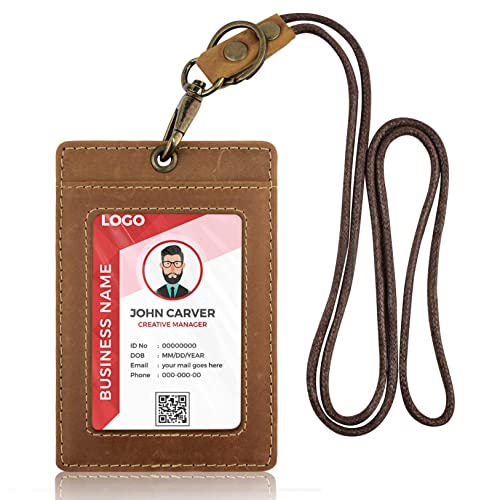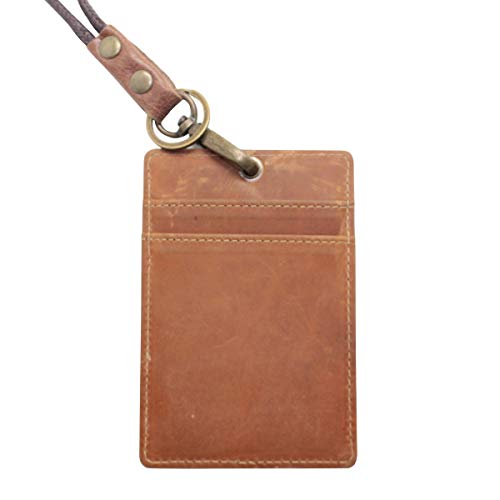 Porta badge in pelle: Boshiho - Porta badge da ufficio in vera pelle con cordino per appendere al collo, portatessere con finestra trasparente - Orientamento verticale (0125-Tan)
