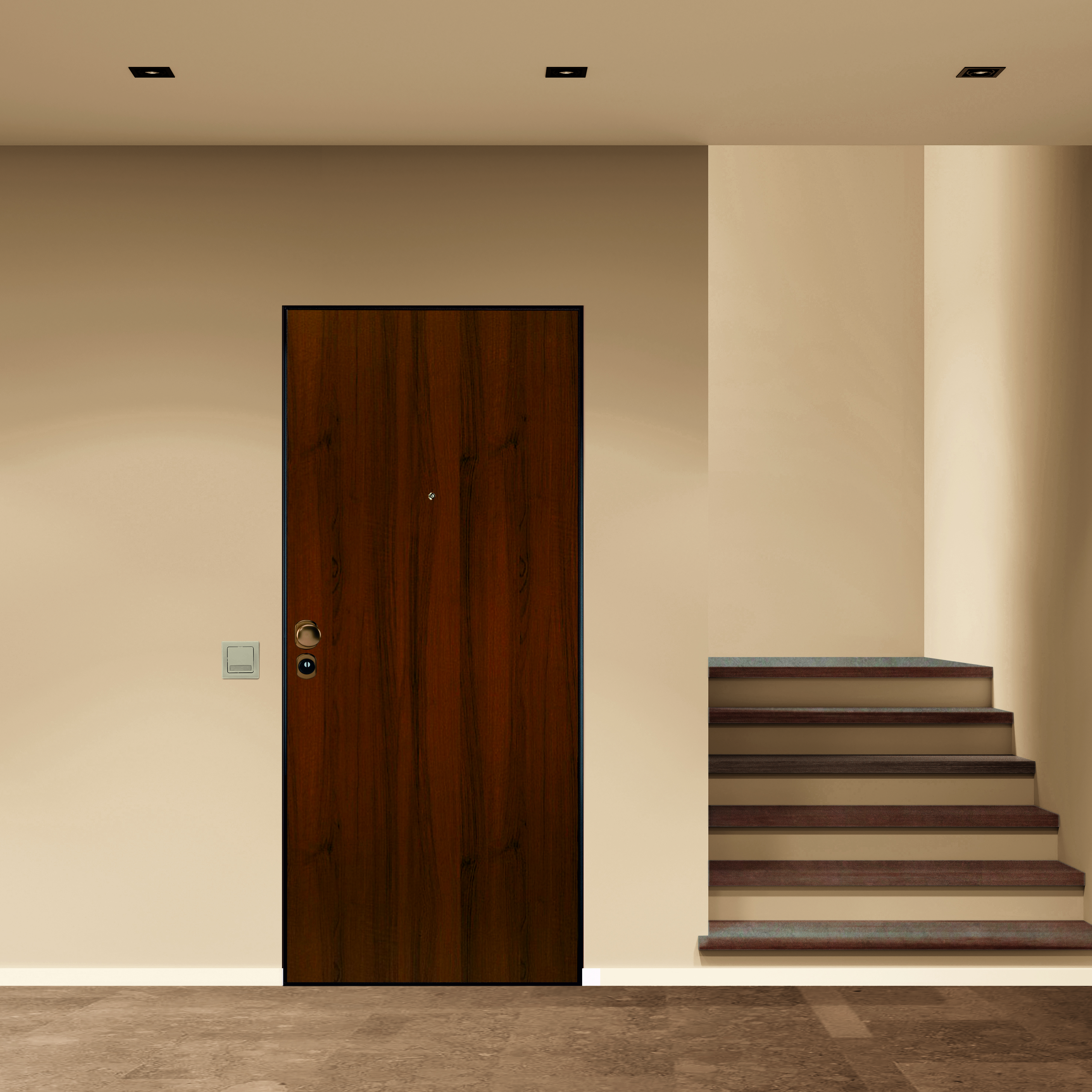 Pannello esterno laminato noce, classe di sicurezza 4, serratura yale cilindro europeo con defender, punti di chiusura 8. Consigliata per appartamenti posti all'interno di un condominio. Pannello indicato per ingressi situati in ambienti interni. La classe antieffrazione 4 garantisce la massima sicurezza per un ambiente domestico, anche in zone ad alto rischio. Soglia antispifferi, aumenta l'isolamento termico ed evita l'ingresso di polvere ed insetti. Limitatore di apertura, permette di aprire la porta parzialmente, tendendola comunque bloccata per maggiore sicurezza