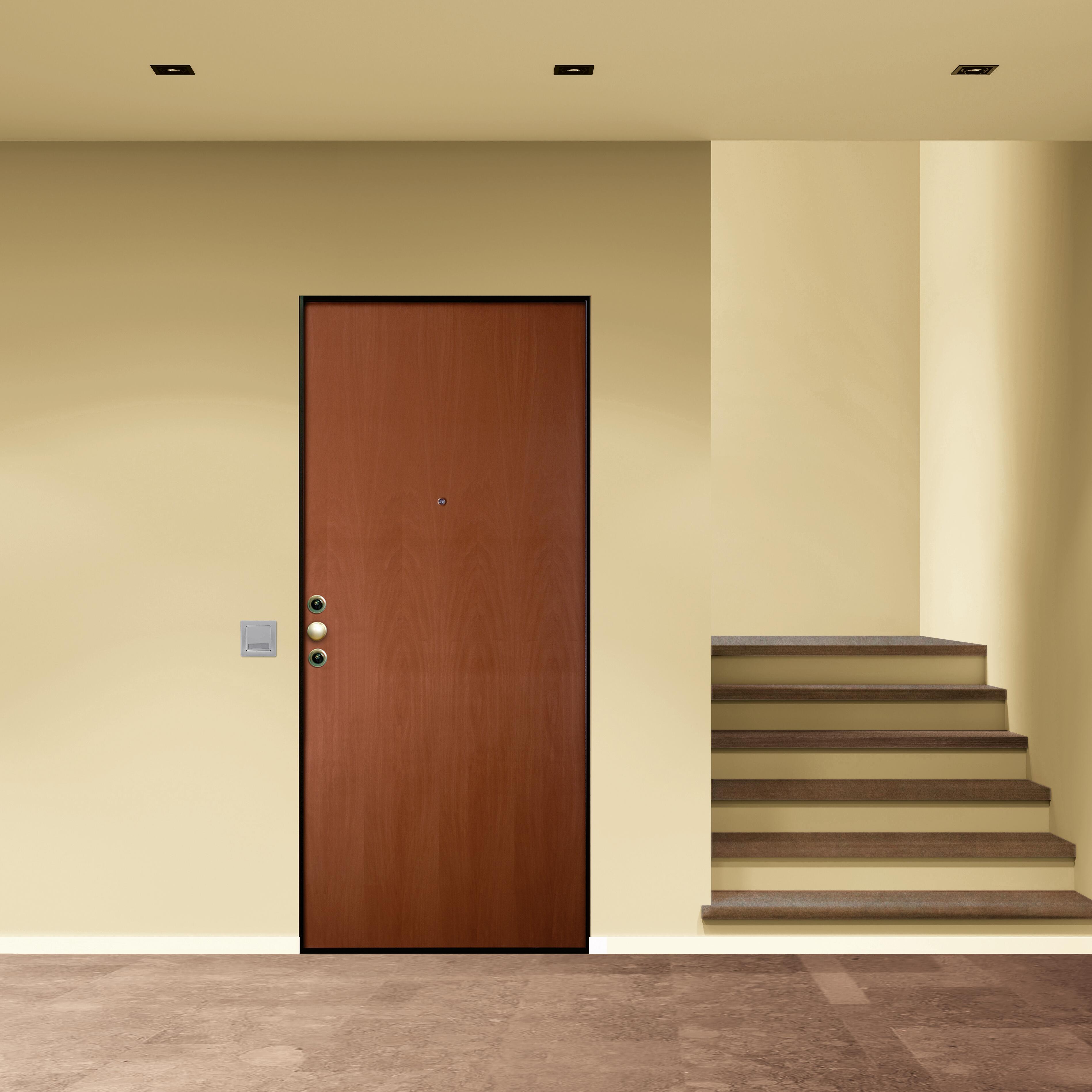 Pannello esterno laminato tanganika medio, classe di sicurezza 3, serratura cilindro europeo con defender, punti di chiusura 8. Consigliata per appartamenti posti all'interno di un condominio. Pannello indicato per ingressi situati in ambienti interni. Protezione antitrapano grazie alla serratura con defender