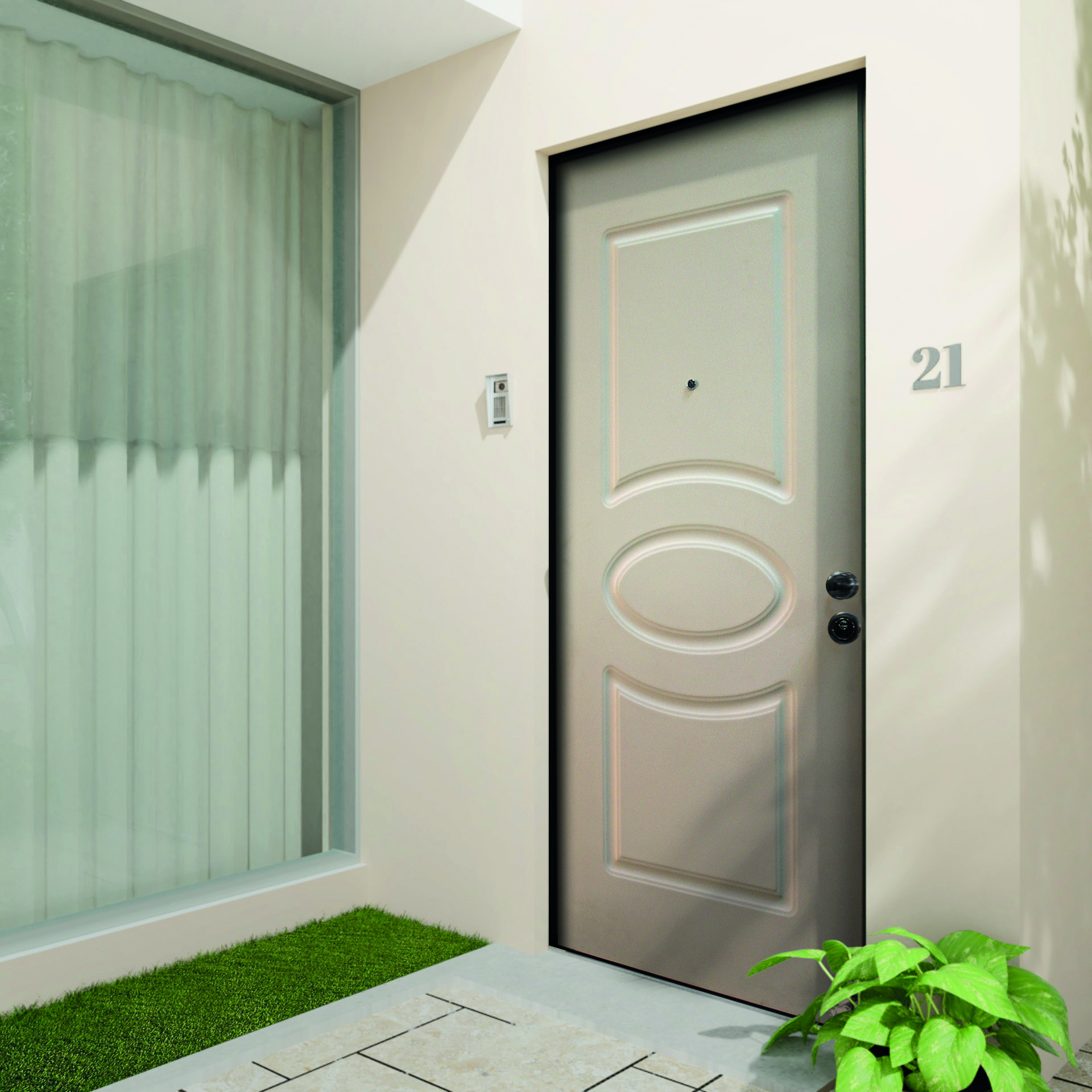Pannello esterno acciaio pellicolato renolit bianco, classe di sicurezza 3, serratura cilindro europeo con defender, punti di chiusura 8. Consigliata per villette e case indipendenti. Pannello indicato per ingressi situati in ambienti esterni esposti alle intemperie. Protezione antitrapano grazie alla serratura con defender. Dotato di soglia a pavimento che protegge la casa da acqua, aria e vento. Soglia antispifferi, aumenta l'isolamento termico ed evita l'ingresso di polvere ed insetti