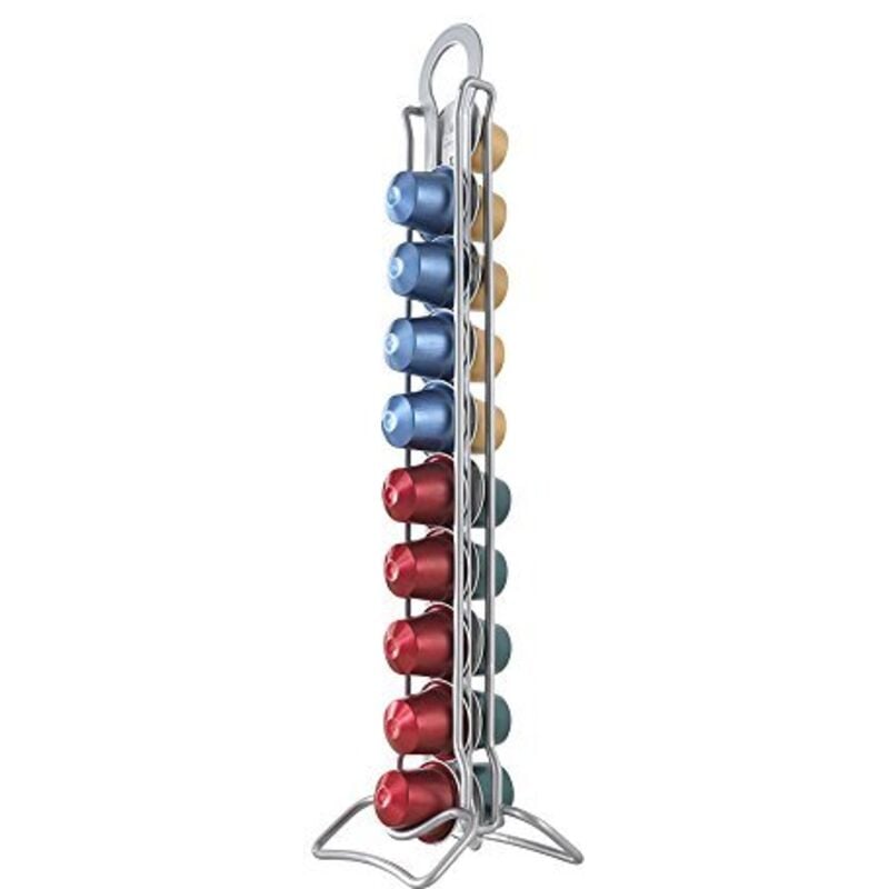 Porta capsule dal design elegante e moderno, ha una capienza fino a venti capsule compatibili nespresso. robusta struttura in metallo rifinita in grigio metallizzato. l'esclusivo rivestimento rende l'articolo antistatico e estremamente resistente alla ruggine.