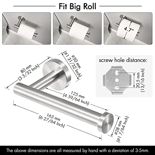 MISURA GRANDE ROTOLO: Max. la lunghezza del rotolo di carta è di 4,92 pollici. La proiezione è di 3,15 pollici. Contiene anche rotoli di carta igienica di grandi dimensioni. La grande manopola in acciaio inossidabile all'estremità della barra impedisce la caduta del rotolo di carta igienica.
