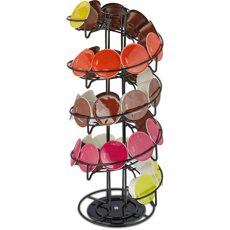 Nell'angolo caffè della tua abitazione regna il caos? Allora non lasciarti scappare questo pratico portacapsule per avere in ordine e a portata di mano fino a 32 cialde della marca Dolce Gusto! L'elegante dispenser è realizzato interamente in ferro e con la struttura a spirale girevole unisce praticità e design: sarà impossibile passare davanti alla macchinetta del caffè senza godersi un espresso della tua marca preferita. Portacialde per capsule della marca Dolce Gusto in dettaglio - Misure complessive H x D: 41 x 17 cm ca. - Larghezza della colonna: 5 cm ca. - Peso: 0,8 kg ca. - Materiale: ferro - Colore: nero Dispenser a chiocciola girevole per cialde di caffè - Per un'organizzazione ordinata delle capsule accanto alla macchinetta del caffè - Espositore per 32 cialde in totale della marca Dolce Gusto - Perfetto per la cucina, l'area caffè in ufficio o l'angolo bar in salotto - Supporto rotante a 360° gradi - per avere le capsule sempre a portata di mano - Design moderno ed elegante