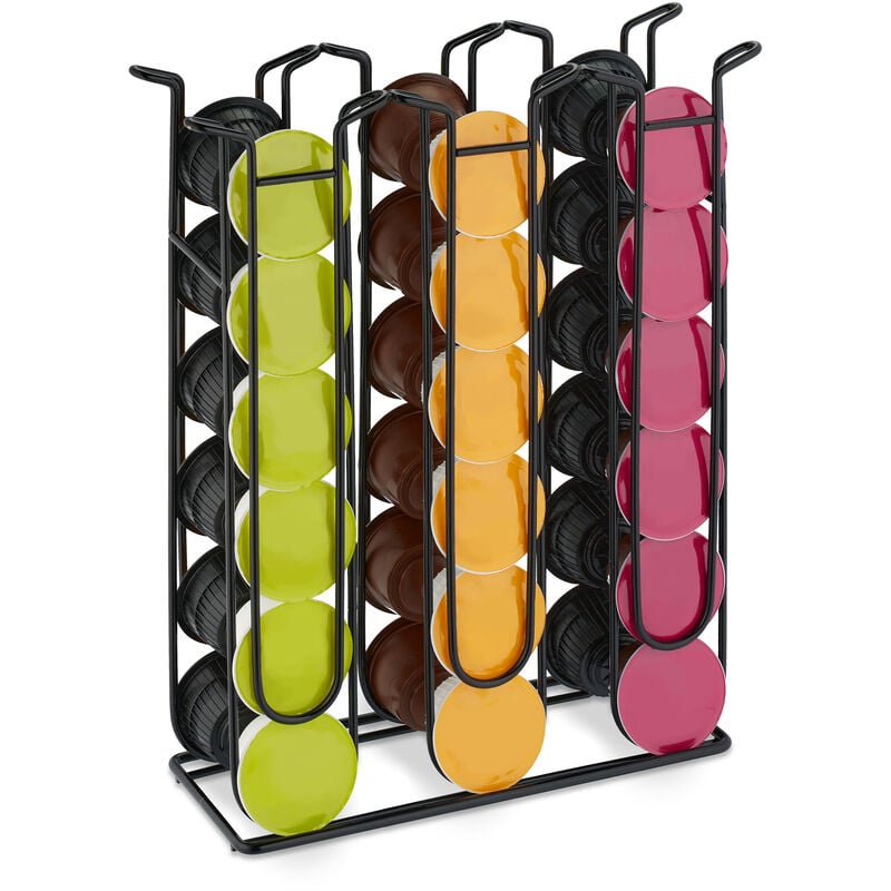 Nell'angolo caffè della tua abitazione regna il caos? Allora non lasciarti scappare questo pratico portacapsule per avere in ordine e a portata di mano fino a 36 cialde della marca Dolce Gusto! L'elegante dispenser è realizzato interamente in ferro e con la struttura a 6 colonne unisce praticità e design: sarà impossibile passare davanti alla macchinetta del caffè senza godersi un espresso della tua marca preferita. Portacialde per capsule della marca Dolce Gusto in dettaglio - Misure complessive H x L x P: 32,5 x 26,5 x 9,5 cm ca. - Dimensioni per colonna portacapsule H x L: 30,5 x 5 cm ca. - Larghezza della colonna nella parte superiore: 8 cm ca. - Peso: 0,9 kg ca. - Materiale: ferro - Colore: nero Dispenser a colonne per cialde di caffè - Per un'organizzazione ordinata delle capsule accanto alla macchinetta del caffè - Espositore per 36 cialde in totale della marca Dolce Gusto - Perfetto per la cucina, l'area caffè in ufficio o l'angolo bar in salotto - Disponi le capsule nelle 6