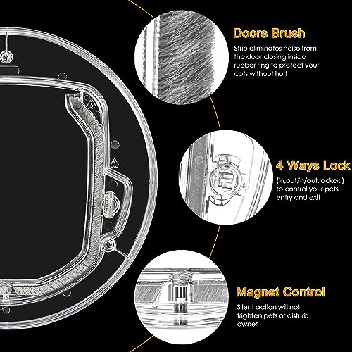 Chiusura versatile a 4 vie: prendi il pieno controllo dell'accesso dei tuoi animali domestici con la nostra porta per gatti dotata di doppia serratura a manopola. Con le modalità a 4 vie, tra cui aperto, bloccato, solo ingresso e solo uscita, puoi gestire facilmente i loro movimenti dentro e fuori casa.