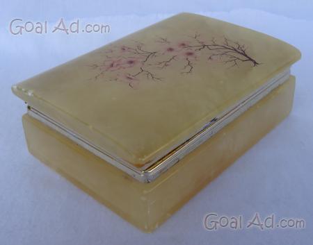 Portagioielli in onice giallo con decorazione floreale sul coperchio. Oggetto artigianale di manifattura italiana e databile negli anni "60, è certamente un oggetto piacevole e decorativo. Misure cm: 14 x 5 x 10. Conservato in buone condizioni. Prezzo Euro 28 + spese di spedizione. Vendita solo in Italia. Consegna diretta in zona senza spese o tramite Posta, Pacco ordinario Pagamento tramite PayPal o bonifico bancario