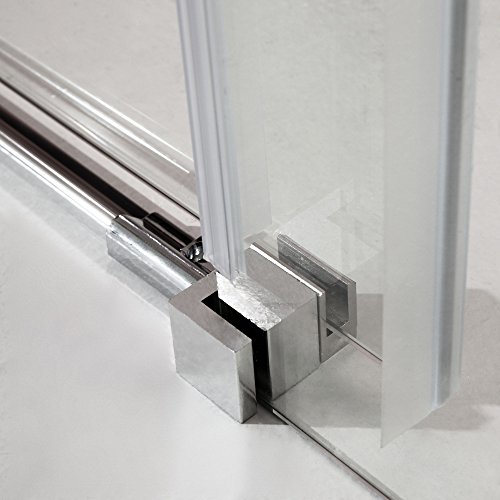 Anta fissa + anta scorrevole in cristallo trasparente. Telaio e coppia di maniglie in cromatura lucida.