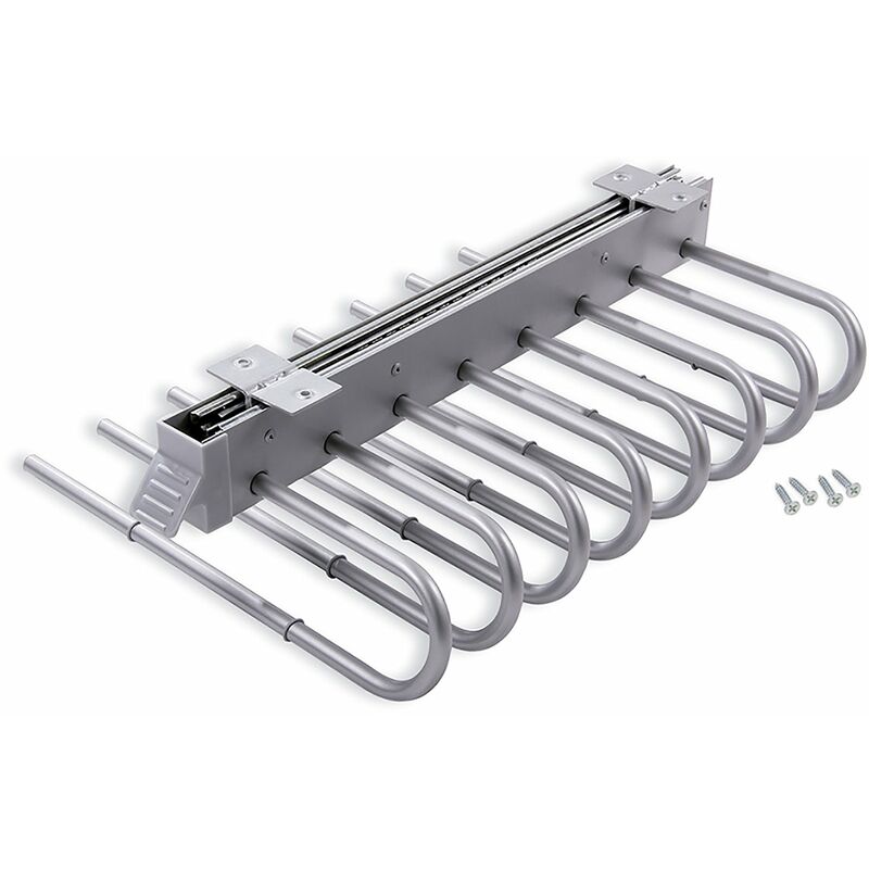 Il porta pantaloni estraibile permette di organizzare in modo efficiente lo spazio all'interno degli armadi, facilitando l'accesso agli indumenti. E' prodotto in acciaio con finitura vernicata alluminio e plastica grigia, e dispone di guide da 450 mm ad estrazione totale. Con maniglia nella parte frontale per facilitare l'estrazione del meccanismo. Prodotto in acciaio e plastica colore grigio metallizzato. Montaggio lato destro. Guide di 450 mm con estrazione totale. Con maniglia per facilitare l'estrazione. Include viti per il montaggio. 1 porta pantaloni estraibile, viti per il montaggio Mano destra Verniciato alluminio Tecnoplastica