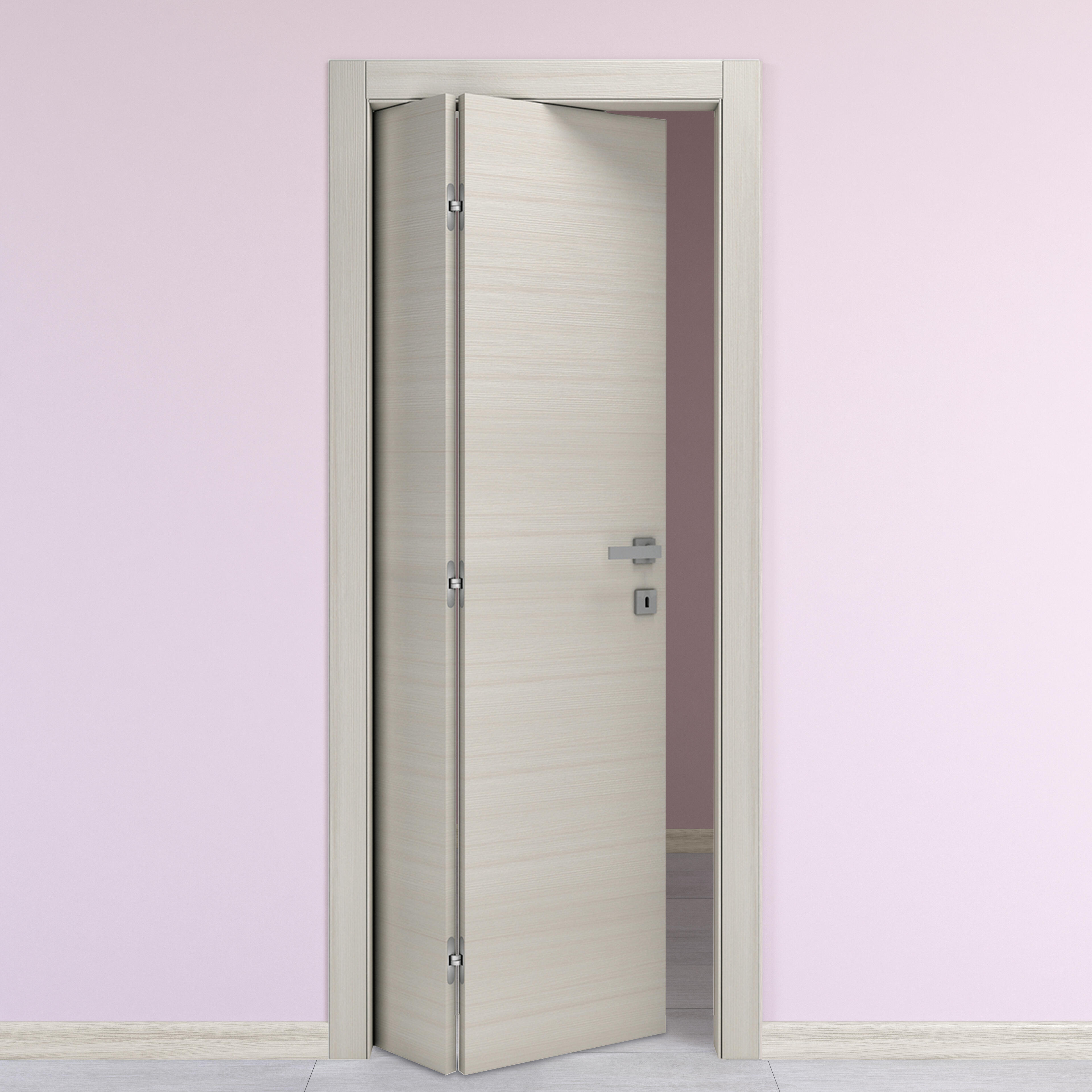 In laminato, telaio dritto, coprifili ad incastro. Con maniglia inclusa. Qualità Excellens, porta di alta qualità che oltre ad essere funzionale valorizza anche gli ambienti. Apertura pieghevole, ideale per utilizzare al meglio lo spazio di apertura. Finitura resistente ai graffi molto facile da pulire. Serratura magnetica. Telaio in listellare