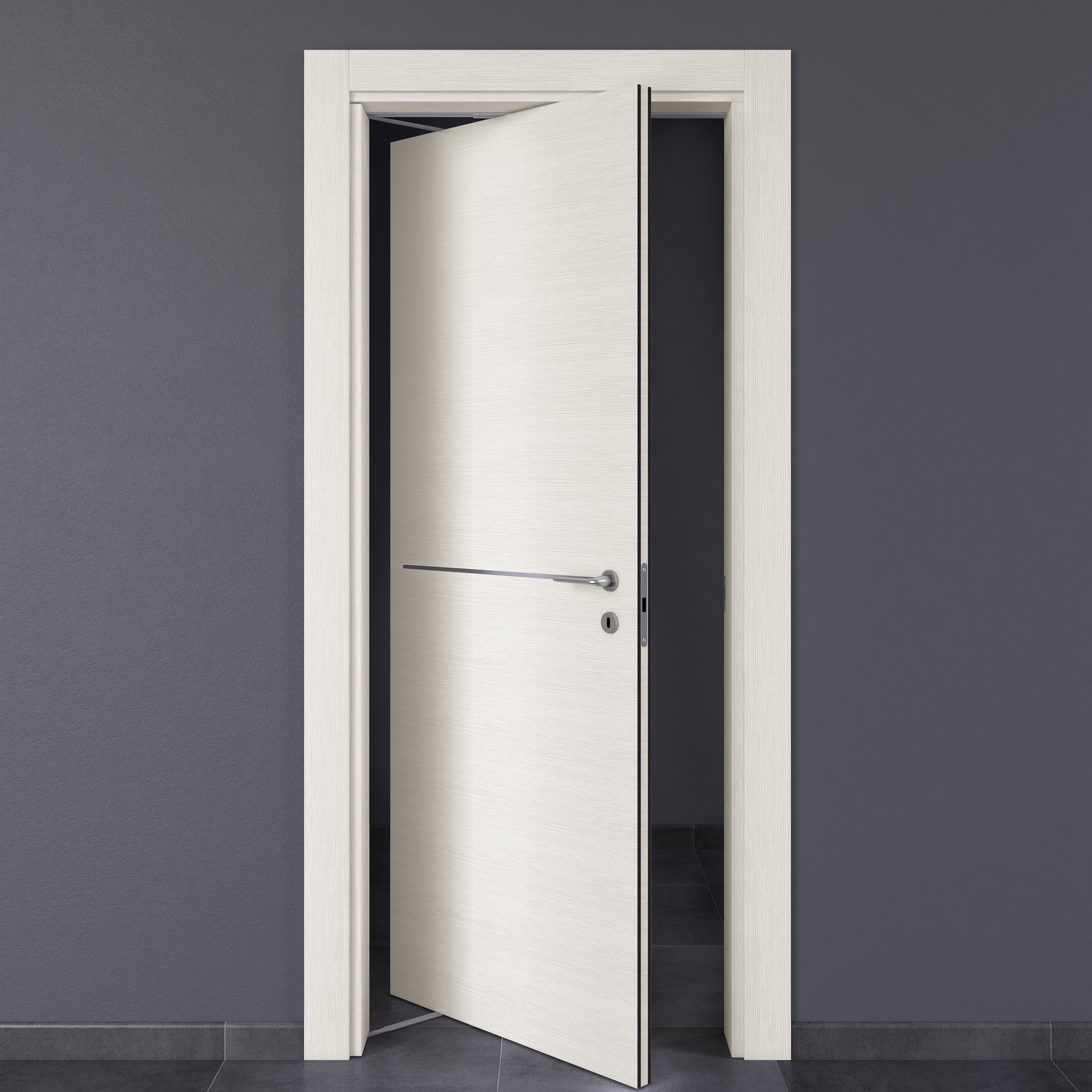 In laminato, inserti cromati, telaio dritto, coprifili ad incastro. Maniglia da acquistare separatamente. Qualità Excellens, porta di alta qualità che oltre ad essere funzionale valorizza anche gli ambienti. Apertura rototraslante, ideale per contenere gli spazi di apertura mantenendo la praticità di una porta battente. Finitura resistente e funzionale. Il laminato resiste ai graffi ed è molto facile da pulire. Effetto spazzolato che riproduce le venature del legno donando un effetto materico molto naturale. Chiusura magnetica silenziosa