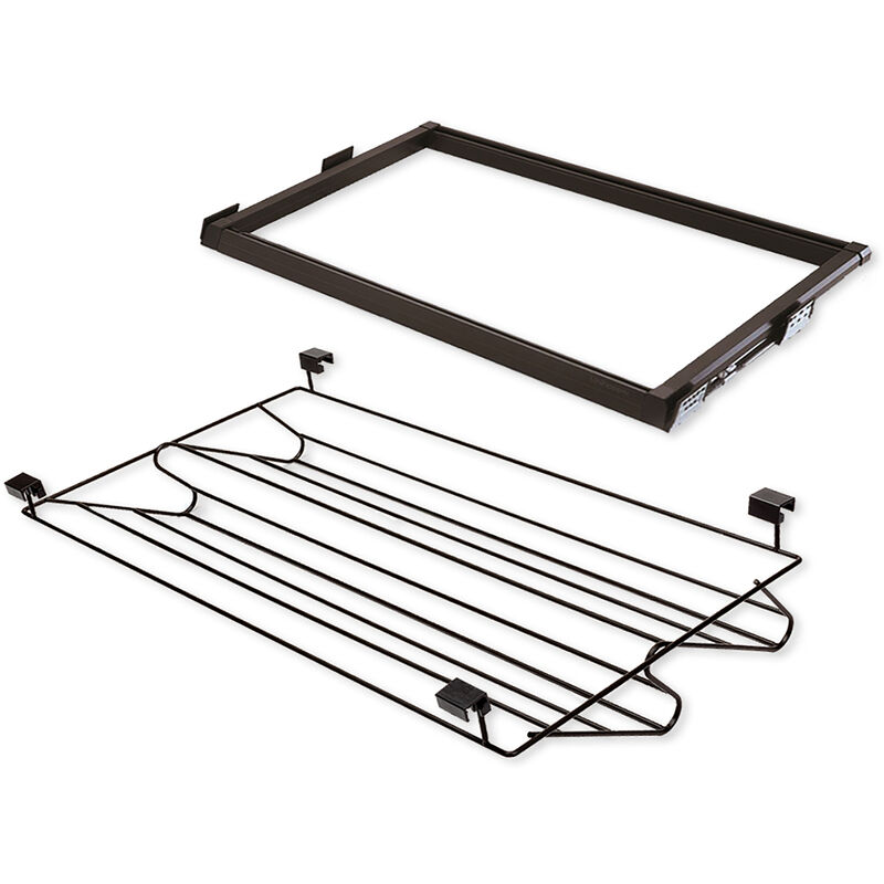 Ideale per un vano interno armadio di 764-814 mm. Profondità minima del mobile 480 mm. Kit composto da un cassetto porta scarpe largo 675mm e da un telaio con guide di larghezza regolabile. Guide a scomparsa con estrazione totale e chiusura soft, con sistema a clip automatico e rapido per l'installazione del telaio. Finitura color moka