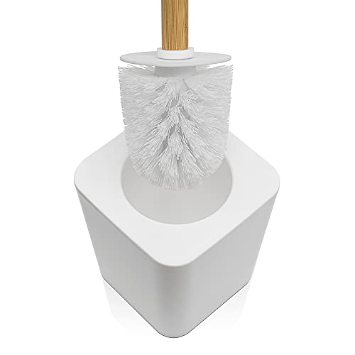 Porta scopino da appoggio per WC, Design Moderno Bianco Opaco, Include scopino ergonomico con Manico in bambù