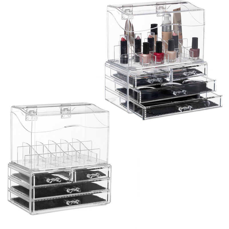 Siete stanchi di infinite ricerche per trovare il vostro rossetto preferito? Allora il porta trucchi è quello che fa per voi. Nei 18 scomparti spaziosi potete riporre i vostri articoli cosmetici ordinatamente, ma anche in modo visibile e ben presentati. I cassetti sono l'ideale per conservare gioielli e altri accessori. Inoltre i cassetti sono dotati di un rivestimento antiscivolo e antigraffio per proteggerne il contenuto. Il porta trucchi è composto da due parti singole, che possono essere impilate e separate secondo le esigenze. Il contenitore in acrilico si presta magnificamente anche come portaoggetti per accessori da ufficio o da officina. Organizer make-up in dettaglio - Dimensioni H x L x P: 25 x 23,5 x 15,5 cm ca. - Con 4 cassetti - Contenitore con coperchio e piccoli scomparti - Peso: 1,5 kg ca. - Materiale: acrilico - Colore: trasparente - Set da 2 organizer Porta trucchi con cassetti e scompartimenti - Dimensioni interne cassetti piccoli H x L x P: 3 x 9,5 x 12,5 cm ca.