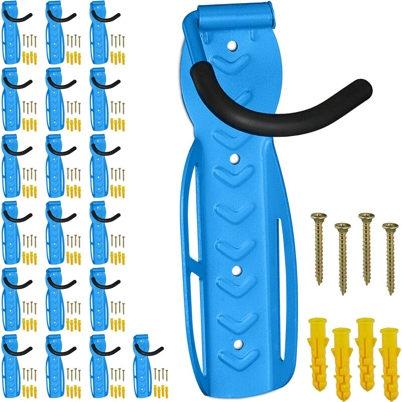 Con il supporto verticale in set, puoi fissare comodamente le biciclette alla parete in modo salvaspazio. La ruota anteriore o posteriore viene semplicemente agganciata alla staffa, mentre i cuscinetti in gommapiuma proteggono i cerchioni dai graffi. I ganci blu possono sopportare fino a 25 kg e permettono di appendere le bici in corridoio, cantina, cortile o garage. In questo modo, la bicicletta è sempre in vista e viene riposta in modo più sicuro rispetto alle rastrelliere all'esterno. Portabicicletteda parete in dettaglio - Dimensionitotale H x L x P: 26 x 11 x 14 cm ca. - Dimensioniinterne per le ruote H x L: 24 x 4 cm ca. - Gancio di gommapiuma H x L x P: 1,5 x 11 x 12,5 cm ca. - Capacità dicarico: circa 25 kg per gancio - Peso: 0,5kg ca. ciascuno - Materiale:acciaio, plastica (PP) - Colore: blu,nero Set da 20 ganci per appendere le biciclette al muro - Supporto per appendere 20 biciclette sulla parete per risparmiare spazio - Appendi bici per la cantina,il garage o il corridoio