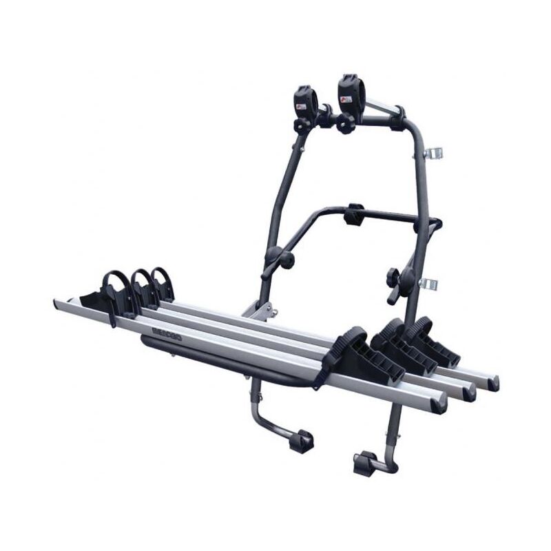Portabici da portellone posteriore in acciaio con canaline poggioruota in alluminio. Fissaggio rapido e sicuro mediante cinghie regolabili. Porta fino a 3 bici (carico max 45 kg). Adatto per la maggiorparte dei veicoli. Non provvisto di serratura. Certificato TUV-GS. Occorre esporre il cartello carichi sporgenti. MENABO PORTABICI POSTERIORE STAND UP 3