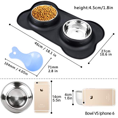 Doppie ciotole rimovibili progettate a prova di fuoriuscite e antiscivolo, 350 ml ciascuna, 700 ml in totale. Una ciotola per l'acqua e l'altra per il cibo. Il vassoio in silicone tiene le ciotole e si attacca al pavimento, il vassoio espanso cattura le fuoriuscite.