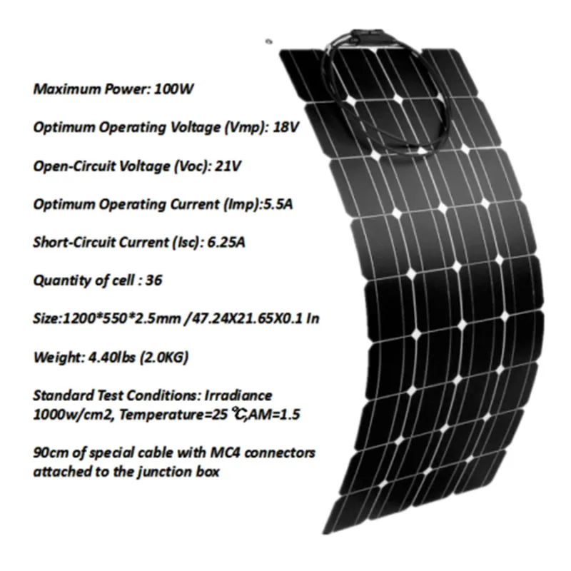 Portable Semi flexible Solar Panel 100W 12V monocsytalline Solar Cell 100W;