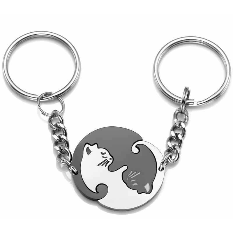 Set di 2 portachiavi puzzle in acciaio inossidabile a tema gatti ying yang per migliori amici, amante, coppia. Idea regalo per amicizia, San Valentino o per ragazze adolescenti. Set coordinato per lui e per lei - Speciale ciondolo yin yang a forma di gatti per mostrare il tuo amore alla persona amata. Design raffinato e unico per coppia o amicizia. Collana alla moda per donna, uomo, ragazza e ragazzo, accessorio di moda ideale perregala, colleziona e indossa tutti i giorni. MATERIALE SICURO - L'acciaio inossidabile ipoallergenico 316L di alta qualità chirurgica presenta un'elevata resistenza alla ruggine, alla corrosione e all'ossidazione e richiede una manutenzione minima, per un ciclo di vita e una durata prolungati.gioiello fatto per durare una vita. DIMENSIONI PERFETTE - Dimensioni gatto: 26 x 21 mm, diametro esterno portachiavi: 25 mm. Lunghezza totale: 77 mm. Quantità: 2 portachiavi a forma di gatto. Viene fornito con una borsa e una custodia in velluto coulisse. REGALO IDEALE