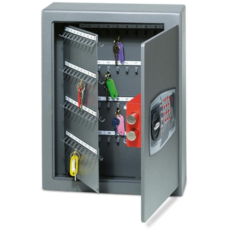 CARATTERISTICHE TECNICHE - Serratura controllata da un congegno elettronico ad alta affidabilitC, dotato di memoria permanente. - Apertura/chiusura con manopola di comando e blocco con elettromagnete. - Alimentazione interna con 4 batterie alcaline da 1,5 V. (non incluse). - Tastiera a membrana con 4 leds dedicati. - Contatti per batteria esterna ricavati direttamente sulla tastiera. - Segnalazioni sonore e visive per conferma digitazione, errori e batterie interne in fase di esaurimento. - Serratura per apertura di emergenza con chiave di sicurezza a doppia mappa. - Catenacci in acciaio nichelato, girevoli, del Ø di 22 mm. - Protezione al meccanismo della serratura con piastra in acciaio al manganese. - Corpo monoblocco saldato e molato con sistemi automatici robotizzati. - Ganci metallici, completi di numerazione adesiva. - 4 fori di ancoraggio sullo schienale e tasselli di fissaggio in dotazione. - Verniciatura a polvere termoindurente con essicazione a forno. - Frontale e Porta 8