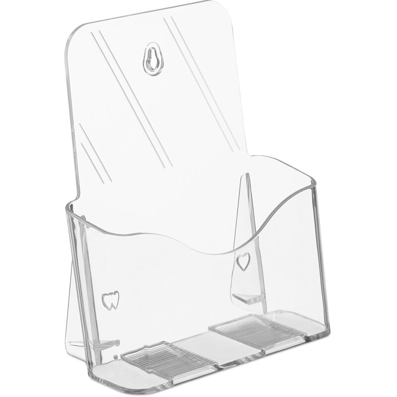 Finalmente potete portar al centro dell'attenzione le vostre brochure & cataloghi con questo efficacie portadepliant da muro o da tavolo. Soprattutto se siete a fiere o eventi, ma anche in una sala d'aspetto o alla reception, non potete lasciarvi scappare questo praticissimo portadepliant da muro che porta all'attenzione dei vostri clienti, o potenziali tali, il vostro materiale pubblicitario. L'espositore leggermente inclinato è realizzato in plastica robusta ed è ideale per tutti i volantini dalla lunghezza standard, secondo i formati ISO A5 (o DIN). Portadepliant da muro o da tavolo in dettaglio - Dimensioni totali H x L x P: 20 x 17,5 x 8,5 cm ca. - Dimensioni interne scomparto H x L x P: 9 x 16,5 x 4,5 cm ca. - Formato: A5 (DIN/ISO) - Peso: 170 g ca. - Materiale: acrilico - Colore: trasparente - Set da 4 Portadepliant da muro o da tavolo trasparente - Per cataloghi, volantini e prospetti dal formato A5 (DIN/ISO) - Per presentare efficacemente il materiale pubblicitario - Perfetto
