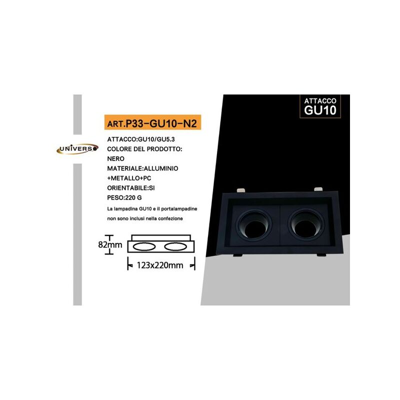 Portafaretto Incasso 2 GU10 Orientabile Rettangolare Nero