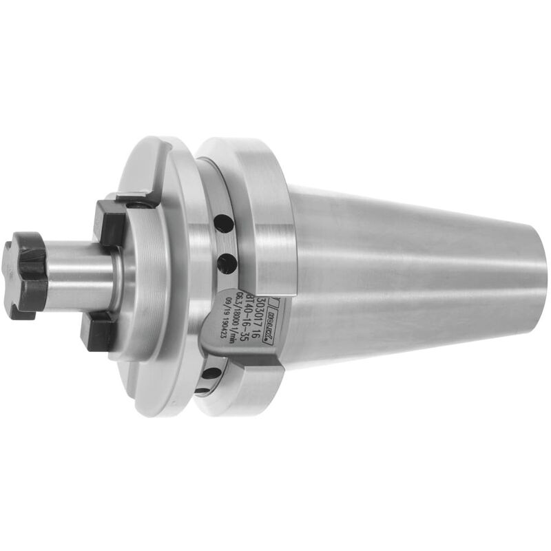 Cono, attacco fresa di supporto e superfici di appoggio rettificati. Tutti i codoli sabbiati con sfere di vetro fine. Qualità di equilibratura G 6,3 / 18.000 min-1). Forma A. Fornitura: Inclusa vite di bloccaggio frese. Accessori speciali: Codoli (AB) n. art. 308760 − 308802. Chiave speciale n. art. 309840. Dati tecnici Forma A Precisione della concentricità radiale µm ≤ 5 Norma DIN 6357 Qualità equilibratura G con numero di giri G 6,3 con 18.000 min-1 Adattatore BT 40 corto Strategia di truciolatura HPC Tipo di prodotto Portafrese con trascinatori frontali ⌀ Attacco D1, mm 16 Sporgenza totale Dim. A, mm 35 Mandrino di ⌀ d1, mm 16 Vite di serraggio per fresa di ricambio n. art. 309860 / 309861 16 Chiave speciale adatta n. art. 309840 16 ⌀ Esterno D, mm 38