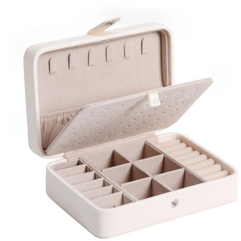 Questo pratico ed elegante portagioielli offre spazio per un gran numero di gioielli. Il design della scatola la rende particolarmente adatta da portare con te quando sei in viaggio. La parte inferiore della borsa contiene una serie di scomparti, adatti, tra l'altro, ad anelli. La parte superiore è particolarmente adatta per riporre collane. In mezzo c'è un cuscino destinato a riporre gli orecchini. - Design pratico e resistente agli urti - Adatto per il viaggio - Tanto spazio per riporre tutti i tipi di gioielli Specifiche: Colore bianco Materiale: pelle artificiale Dimensioni: 16 x 11 x 5 cm...