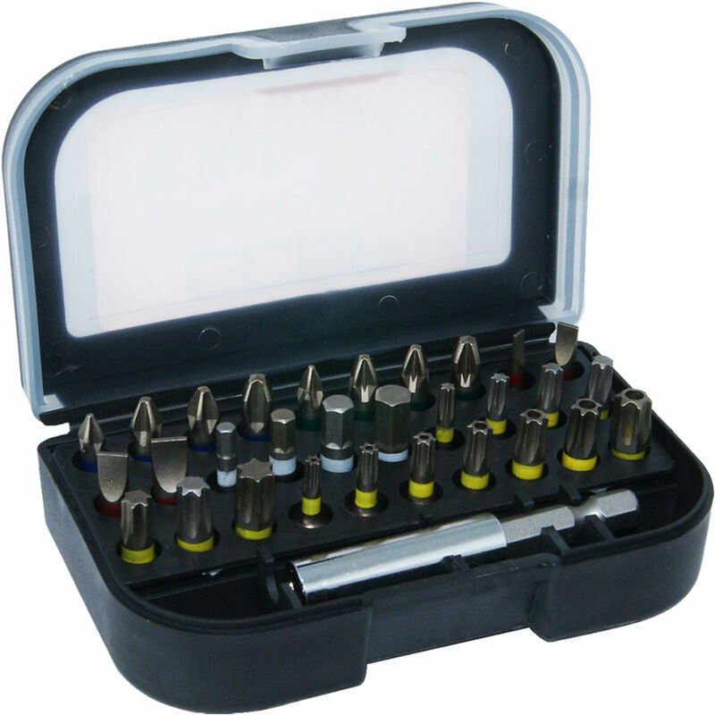 In astuccio plastica. A norme DIN 3126. Attacco 1/4'. Composizione: 1 portainserto magnetico, 1 pezzo PH1, 2 pezzi PH2, 1 pezzo PH3, 1 pezzo PZ1, 2 pezzi PZ2, 1 pezzo PZ3, 1 pezzo per tipo LM3, LM4, LM5, LM6, 1 pezzo per tipo ES3, ES4, ES5, ES6, 1 pezzo per tipo TX10, TX15, TX20, TX25, TX27, TX30, TX40, 1 pezzo per tipo TA10, TA15, TA20, TA25, TA27, TA30,TA40.