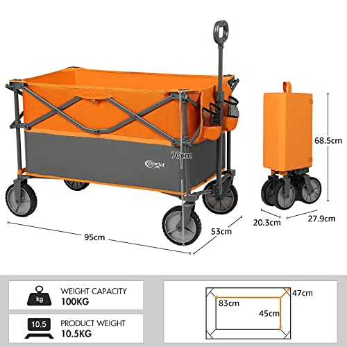 Eccellente capacità maggiore: Le dimensioni interne di questo carro da giardino sono 83 x 45 x 47 cm, più grandi della maggior parte dei carrelli sul mercato. Nel frattempo non influisce sul peso e sulle dimensioni pieghevoli, ad es. è ancora leggero e compatto come altri carrelli pieghevoli più piccoli.