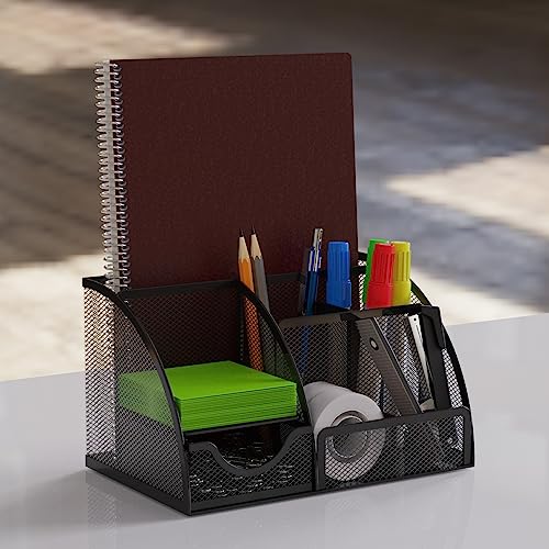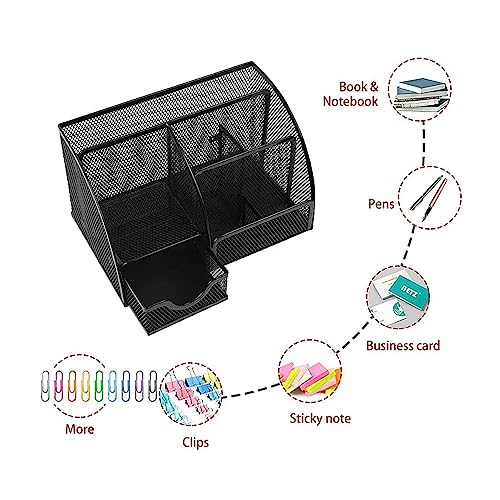 Portaoggetti da scrivania e portapenne con cassetto e 6 scomparti in rete metallica nero. Organizzatore per scrivania che risparmia spazio per penne, matite, post-it, mollette e graffatrici