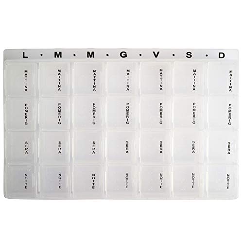 PortaPillole Settimanale (ITALIANO) Contenitore per Pillole a 7 Giorni, Ogni Giorno Scomparti per Mattino, Pomeriggio, Sera, Notte, Promemoria per Pillole 28 Scomparti (1 Pack, Bianca e Trasparente)