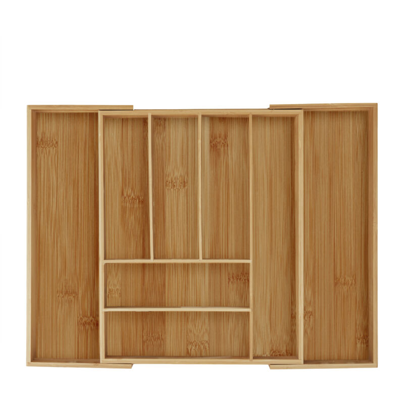 Quantotempo perdi nel cercare mestoli e posate mentre cucini o apparecchi la tavola?L'organizer per posate è ciò che stavi cercando, per risparmiare tempo e pertenere sempre in ordine e puliti i tuoi cassetti. Dotato di 6 scomparti più dueestensibili, il portaposate si adegua a tutte le tue esigenze di spazio.Utilizzabile anche per gli articoli di cancelleria o da cucito, l'organizer dacassetto ha un design moderno e lineare che si adegua a tutti i tipi diarredamento. Il bambù si pulisce velocemente con un panno umido. Attenzione: Misurate attentamente ilvostro cassetto e controllate la lunghezza delle vostre posate. Portaposate da cassetto in dettaglio - Dimensioni da chiuso H x L x P: 6,5 x 35 x 43 cm ca. - Dimensioni da aperto H x L x P: 6,5 x 57,5 x 43 cm ca. - Peso: 1,8 kg ca. - Materiale: bambù, legno MDF - Colore: naturale Misure del portaposate in dettaglio - Scomparti laterali HLP: 5,5 x 11 x 41,5 cm ca. - Scomparto lungo HLP: 5 x 7,5 x 40 cm ca. - Scomparti verticali HLP: 5